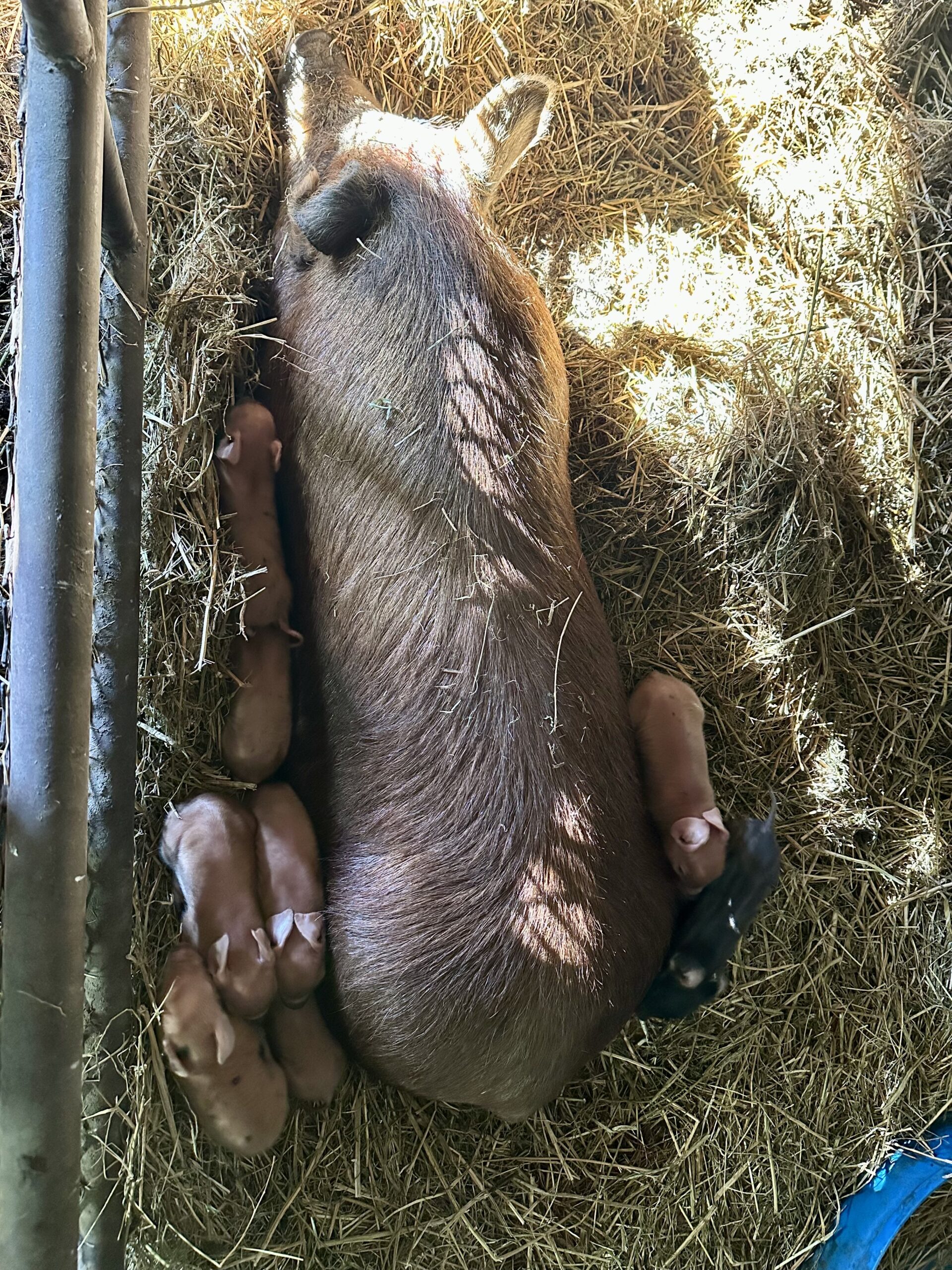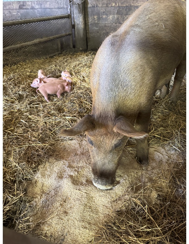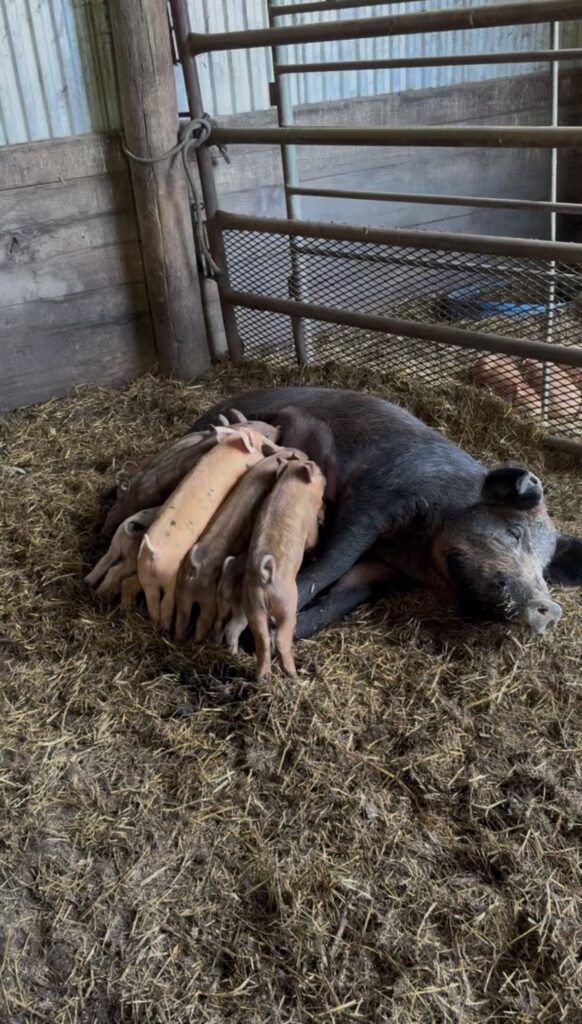 These are “no fuss” pigs. For farrowing, we typically sort them off into their own pens and give them daily feed and water. Otherwise, they manage their litters on their own with an average litter size of 8 per sow. Raised on a corn and soy free diet without any vaccines or other medical intervention besides teeth clipping and castration at a week old.