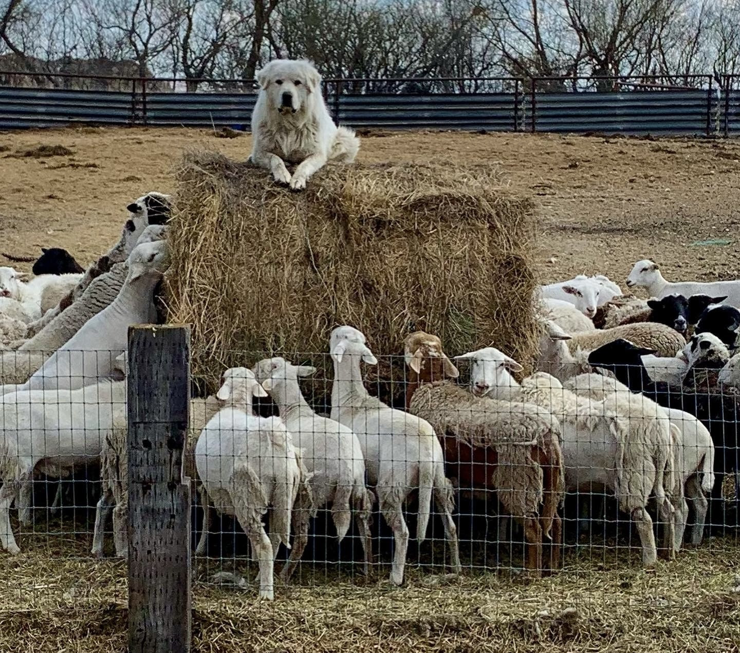 Titan, a Maremma/Great Pyrenees mix, guarded our flock of ewes for many years, keeping them safe from all predators as well. He is in retirement now since we only have sheep seasonally but still actively guards the yard.